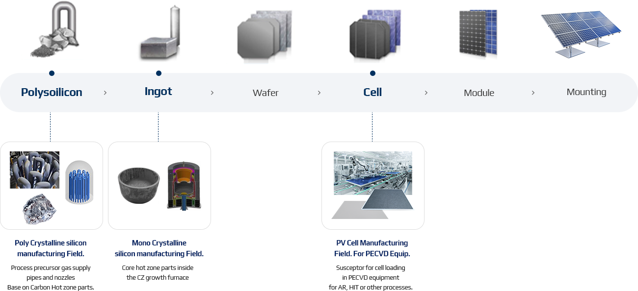 MiCo develops and provides carbon parts for composite materials based on customer needs by incorporating surface treatment technology for core parts inside PECVD equipment, which is a key in PV cell manufacturing equipment.